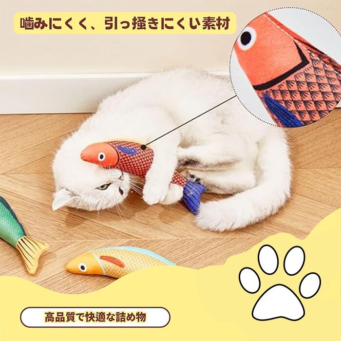 魚の形状 -- 細長いフォルムで蹴りやすい魚デザインを採用しており。猫さんが簡単に噛みつけられ、ストレス解消に効果的です。