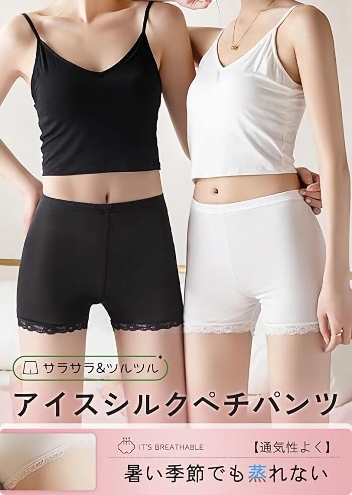 【ツルツル サラッとした冷感生地】柔らかで滑らかな触り心地で、接触冷感加工を施され、履いた瞬間爽やかな感じがするペチパンツです。薄型タイプなので、着用してることを忘れるほど快適で、皮膚が自由に呼吸できます。通気性もポイントで、吸湿速乾、蒸れなく、汗ばむ季節も一日中さらっとして爽やかな感覚を与えてあげます。