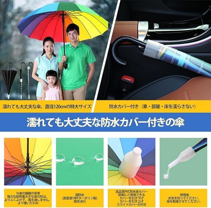 【大きめサイズと安定感最高&撥水速乾】全長約95cm、重さは580gになります、直径が約120cmのビッグサイズの傘です。大人が入ることのできる大型モデル。傘表面は190T高密度ポンジー生地を使用し、撥水性、防水性及び耐水性を極め、素早く乾きます。小柄な人ならすっぽり収まるサイズ!大柄な男性が差しても窮屈に感じない余裕のある大きさです。大事な書類やバッグが濡れないのは嬉しいですよね。