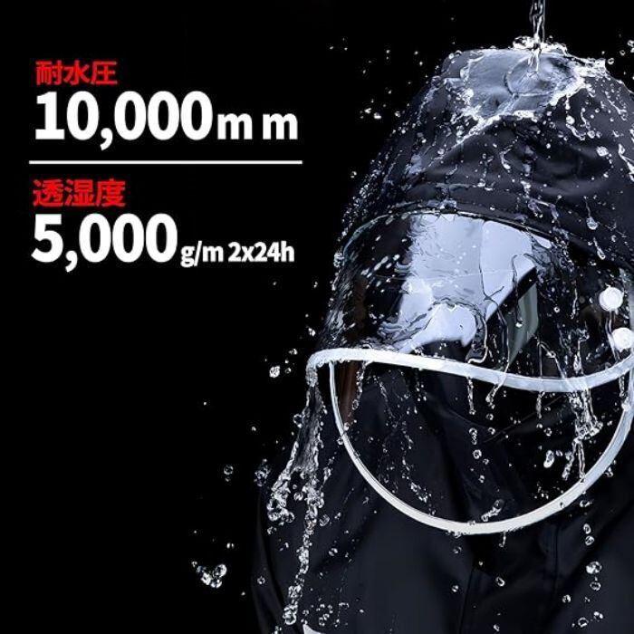 【最強防水/透湿性能】最強防水&透湿性抜群で快適なレインウェア上下セットとして、雨や風から体をしっかり守ります。多重撥水加工により、水が生地に染み込むことなく弾け、ファスナーとボタンの二重設計で雨水や風の侵入を防ぎ、袖口は調節可能な絞り機能付きで、雨や雪、冷たい風からも安心です。