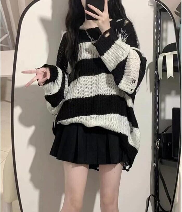 セーター レディース ダメージニット ストライプ 長袖 チュニックプルオントップス ゆったり カジュアル おしゃれ 原宿系 ストリート春夏秋服お出掛けデート 壊れたようなデザイン個性と態度を与えた衣類 ストリート系ファション若者魅力的人気ものセーター | OnionStyle