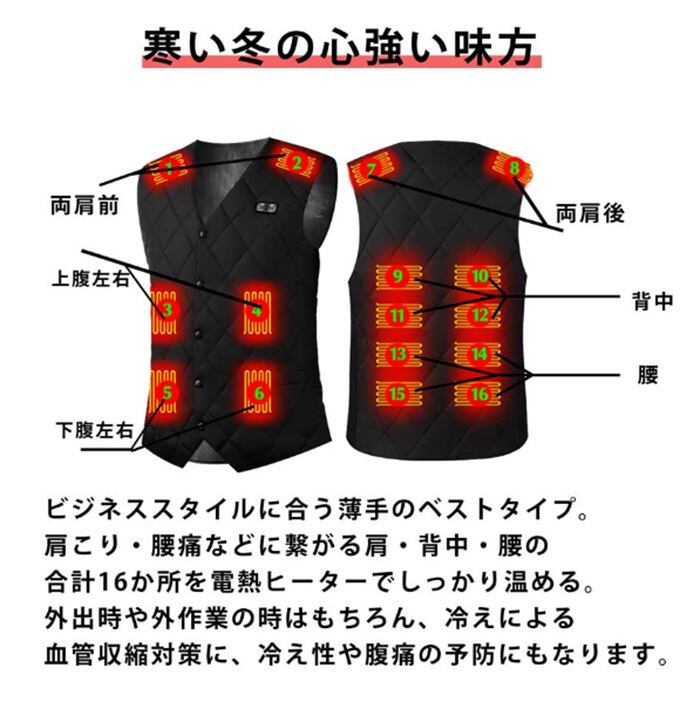 24年新品★電熱ベスト16枚繊維 バッテリー付き 3段温度調整 ヒーターベスト ヒートベスト 温熱ベスト 電熱ジャケット 発熱ベスト USB 電熱ウェア 速暖 前後独立設定 水洗 大きいサイズ レディース メンズ 加熱 ビジネス 30日間保証 加熱服 水洗え 男女兼用 防寒ベスト | OnionStyle