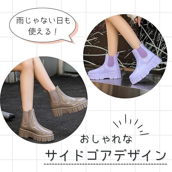 【特徴】高品質な素材と一体成形、プラスチック技術による滑らかで繊細な質感豊かなレインブーツ: 高級PVC素材を採用し、人体にも無害で環境に優しい。耐摩耗性にも優れています。 通気性の高い内部は蒸れにくく、常にドライな状態を保つ: 蒸れにくい快適な履き心地で、雨の日でも足を快適に保ちます。 トレンドをリードするショートブーツタイプのレインシューズ: トレンド感のあるデザインで、雨の日もオシャレに過ごせます。 PVC素材のアッパーなので水を弾いて、お手入れも簡単: 汚れに強く、お手入れが簡単♪ ストリートテイストの厚底ソールでどんなスタイルにも合わせやすい: つま先約3cm、ヒール約5cmの厚底ソールでスタイルアップ効果があり、どんな服装にも合わせやすいです。 デニム、ショートパンツ、スキニーパンツ等に合わせて普段使いするのにはもちろん、普段使いにもぴったりなデザインです。 キャンプやバーベキュー、野外フェス、野外イベント用としても大活躍: アウトドアシーンにもぴったり! 特殊加工によって濡れた場所でもグリップ力を発揮し、滑りにくく、耐摩擦性に優れている: 雨の日でも安心して歩けます。