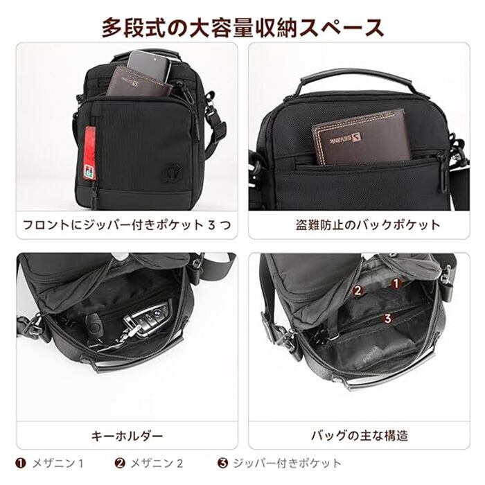 【大容量、多機能のボディバッグ】毎日の外出先での収納に便利な、内側と外側に6つのポケットをデザインしました。財布、携帯電話、鍵、充電器、折りたたみ傘、水筒、本、7.9インチiPad、Switchなどを収納することが可能です。
