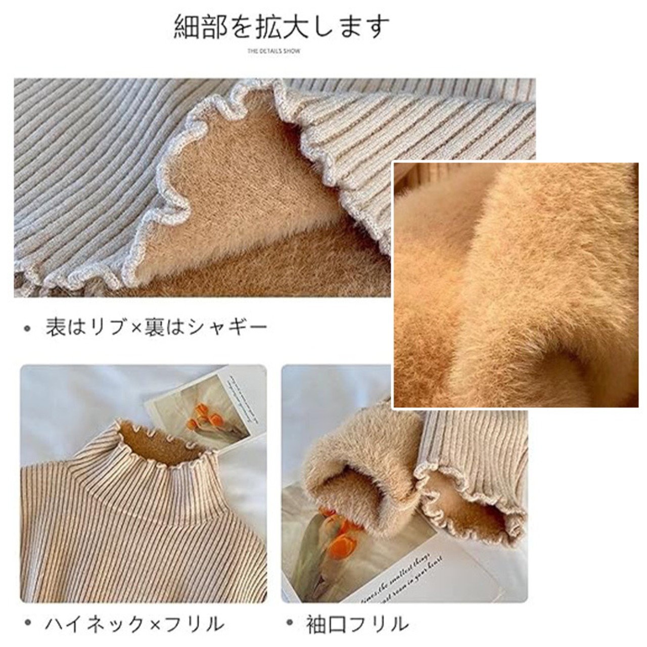 春まで使える!メロウフリルハイネックニットトップス。素材もちもちのニットとなめらかな肌触りの裏ファーで体感+5℃の暖かさ。