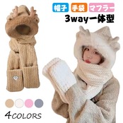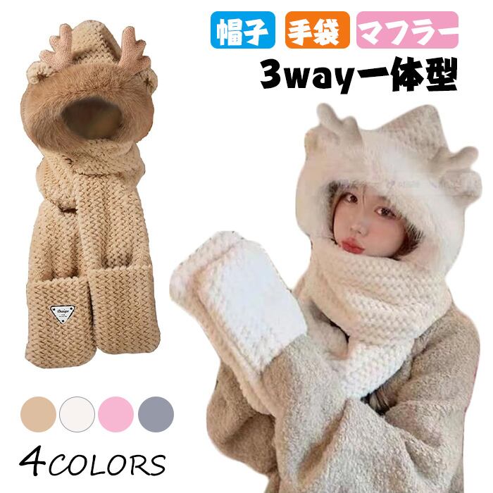 帽子 マフラー 手袋 一体型 フード付きマフラー 手袋 3点セット 一体型 ふわふわ レディース 帽子 鹿角 3in1 スカーフ 秋冬 もこもこ 防寒対策 アウトドア お出かけ プレゼント保温 防寒 多機能 3wayのマフラー 帽子 手袋 通学 通勤 パーティー 可愛い 人気 帽子 | OnionStyle