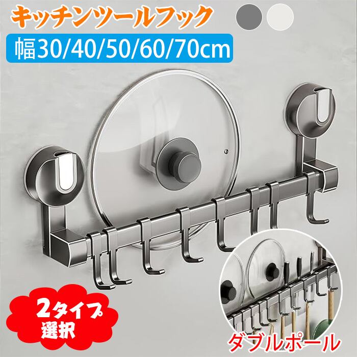 キッチンツールフック 吸盤 フック 強力 アルミニウム キッチンラック 防水防錆 キッチン収納 調理器具 鍋蓋置き キッチンツール 収納 壁掛け 可動式フック 壁 傷つけない 40cm 8個フック (グレー ベージュ, 幅40cm) 使いやすい ツールフック 多機能 キッチン用品 大容量 | OnionStyle
