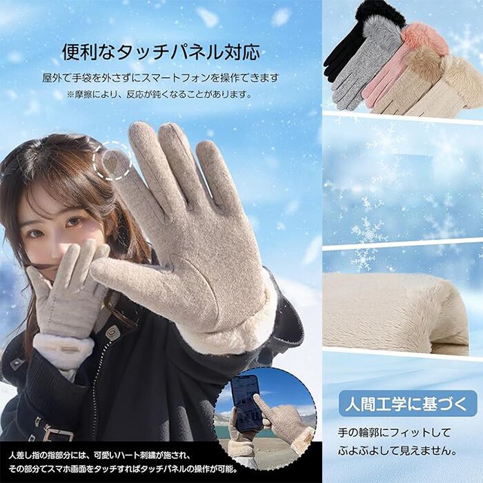 【ふわふわ手首かわいいデザイン】手首にふわふわのファーが設計されて、おしゃれだけではなくて、冷たい風を防ぎ、しっかり中の温度を保ちます。厳選された素材で作られ、ふわふわして肌に優しい柔軟性とストレッチ性が特徴です。肌触りが柔らかく快適で、肌にやさしくて刺激がありません。