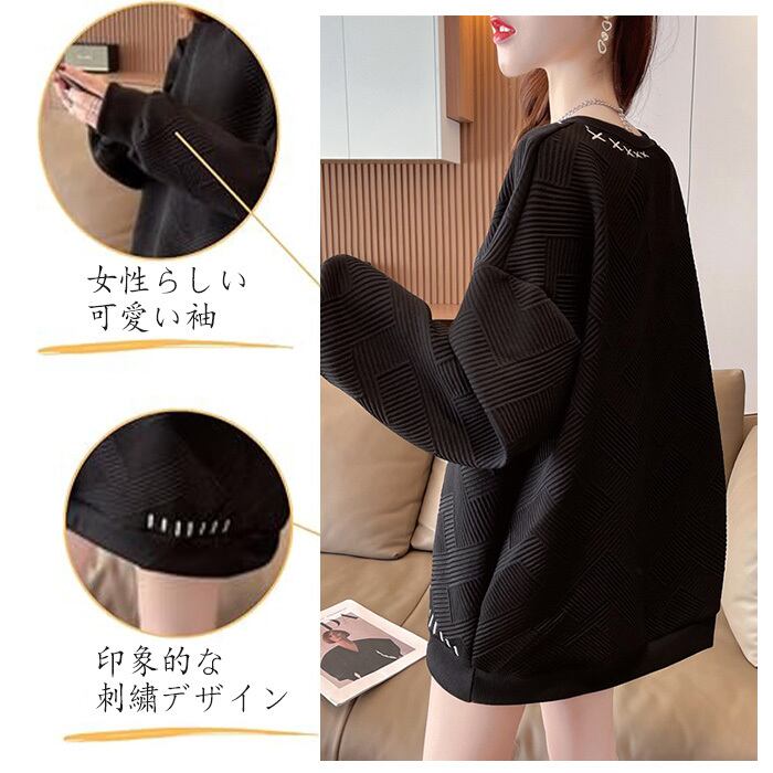 【大きめシルエットで自然に体型カバー】このトレーナーは大きめシルエットが特徴で、自然に体型カバーをしてくれます。ゆったりとしたデザインで、二の腕を細く見せる効果があり、ふんわりとしたシルエットが美しい印象を与えます。メリハリのあるコーデが完成し、どのようなスタイルにもアクセントを加えることができます。